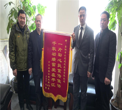 1月22日,平江縣梅仙鎮(zhèn)玳璋村幫扶對象,將一面寫著"一片初心扶貧傳佳話,千秋功績留愛在平江"18個大字的鮮紅錦旗送到市水建投董事長劉寶山、總經(jīng)理楊雄輝的手中,對市水建投對精準扶貧工作的大力支持表達誠摯謝意。